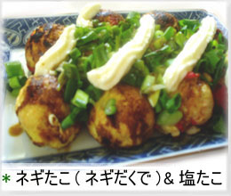 某たこ焼き屋さんで有名なネギたこと塩たこ焼きです。
