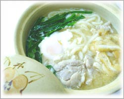 ③うどんを加え煮、ニラを加え最後に卵を