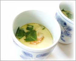 ⑤④をざるでこし茶碗蒸し容器にうどん・エビを
