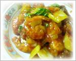 ②Aをエビにからめ揚げる。殻付きの場合よく油通しして下さい。